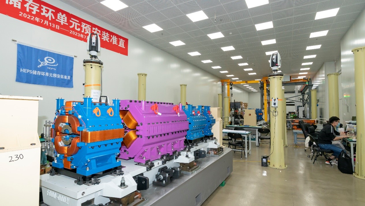 HEPS储存环单元预安装准直工作于今年7月启动,储存环全环完成设备放线,隧道正在进行单元支架的混凝土基座及通用设备的安装,基座灌浆已完成157台;储存环各硬件系统均处于紧张的设备加工和调试阶段。
