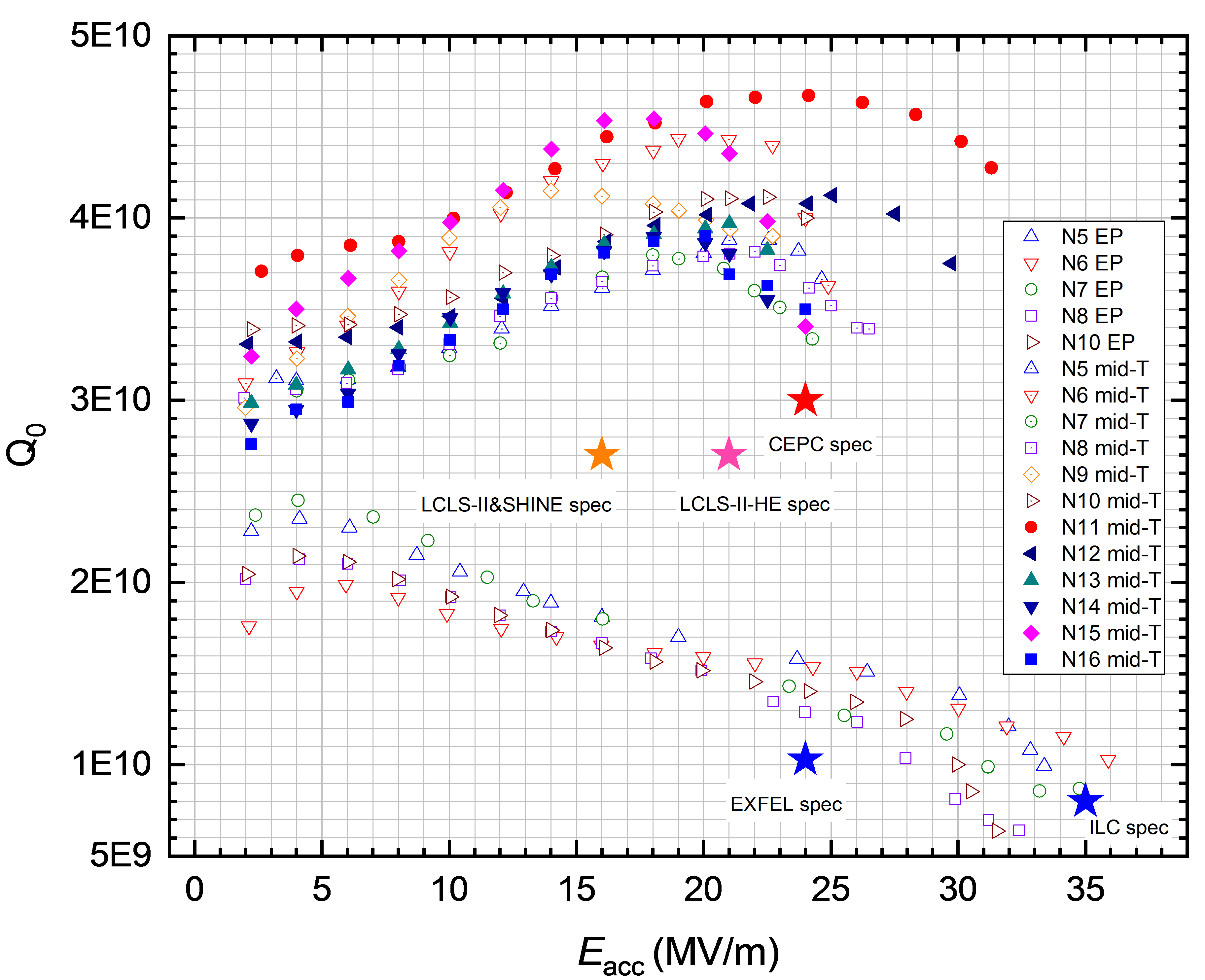 本次研发的6只9-cell超导腔(图中N11-N16)相比上一批6只腔(图中N5-N10),平均最高加速梯度提高15 %,21 MV/m时的平均Q值提高10 %,超过了上海硬X射线自由电子激光装置(SHINE)、环形正负电子对撞机(CEPC)及国内其他相关项目的超导腔设计指标,并优于美国直线相干光源二期(LCLS-II)及其能量升级项目(LCLS-II-HE)的掺氮(N-doping)超导腔性能,进一步验证了中温退火工艺超导腔批量用于大科学工程的稳定性和可靠性。此外,中温退火工艺把掺氮工艺所需的3次电化学抛光(EP)减少为1次,极大简化了表面处理工艺,具有明显的优势。