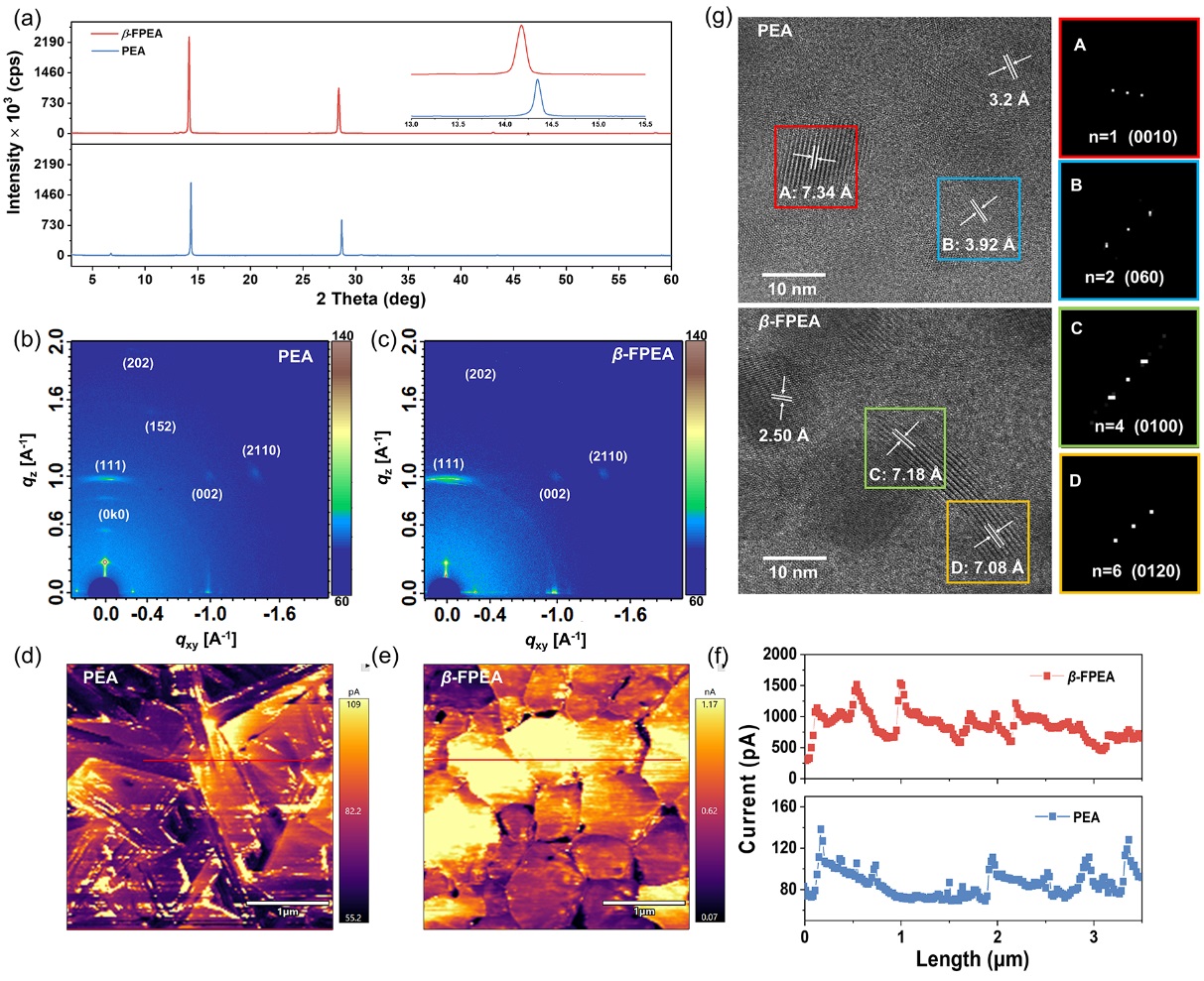 图 基于苯乙胺(PEA)和β-氟苯基乙胺(β- FPEA)的准二维钙钛矿薄膜的X射线衍射谱图,二维-广角掠入射X射线散射谱图,导电原子力显微镜和透射电镜谱图。