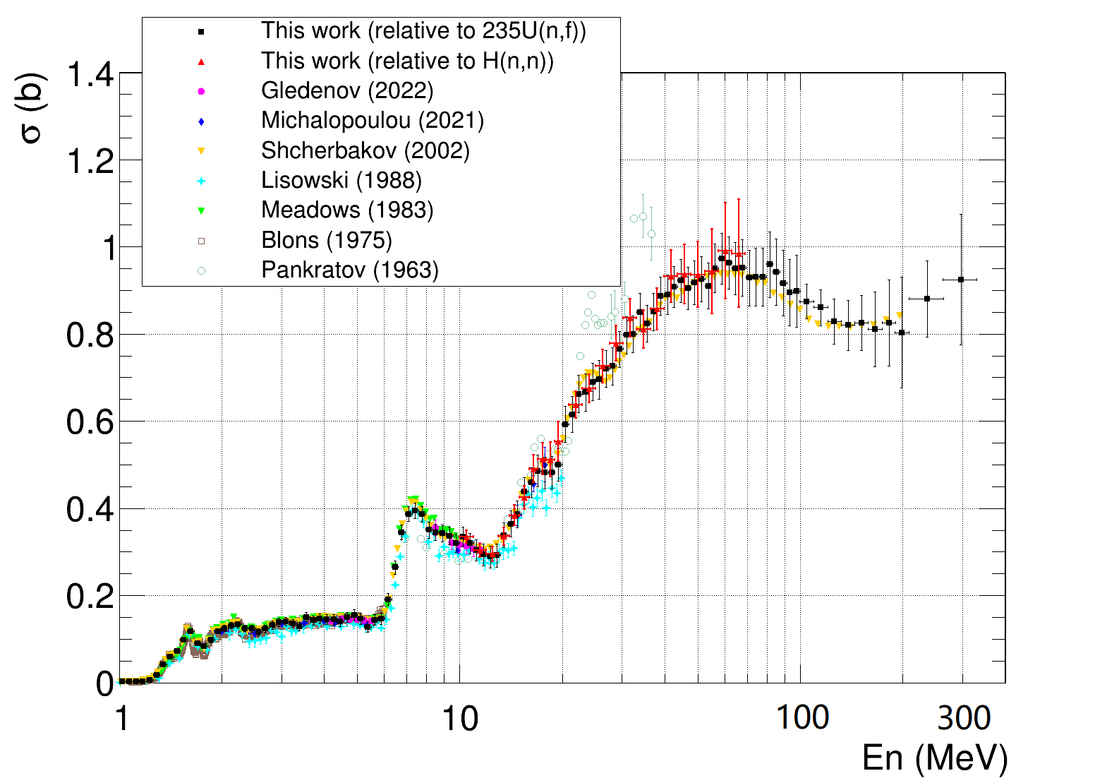 高能所和核物理与化学研究所的研究人员充分发挥和利用Back-n宽能谱的特点,测量了1-300 MeV中子能区232Th的裂变截面。其中,快中子能区的截面数据对钍铀循环非常重要,20 MeV以上的高能中子截面数据对核数据评价和核裂变应用非常重要。EXFOR数据库显示该工作测量到的最高中子能量(300 MeV)是目前公开发表的232Th裂变截面数据中的最高能量。审稿人对这一工作给予了高度评价:“这是一项新颖和非常有趣的工作,它对核数据评价库和核裂变应用具有高影响力。这项工作中的中子能量高达300 MeV,而EXFOR库中此前的实验数据没有超过200 MeV。这有助于更好地理解中能区裂变”。此项工作受到了国际原子能机构(IAEA)的关注,高能所东莞研究部加速器技术部副研究员陈永浩受邀在不久前召开的IAEA中子标准技术会议中作报告介绍了相关工作。