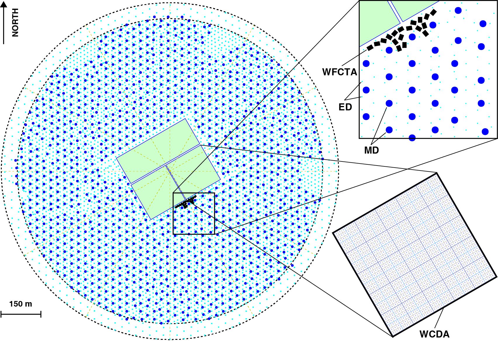 LHAASO是以宇宙线观测研究为核心的国家重大科技基础设施,位于四川省稻城县海子山,平均海拔4410米,占地面积约1.36平方公里。LHAASO由三个阵列组成:5216个电磁粒子探测器与1188个缪子探测器联合构成的1平方公里的地面簇射粒子探测器阵列(KM2A)、3120个探测单元构成的78000平方米的水切伦科夫探测器阵列(WCDA)、18台望远镜构成的广角切伦科夫望远镜阵列(WFCTA),可以宽波段、多手段地测量来自于高能天体的伽马射线和宇宙线,开展天体物理等方面的研究。