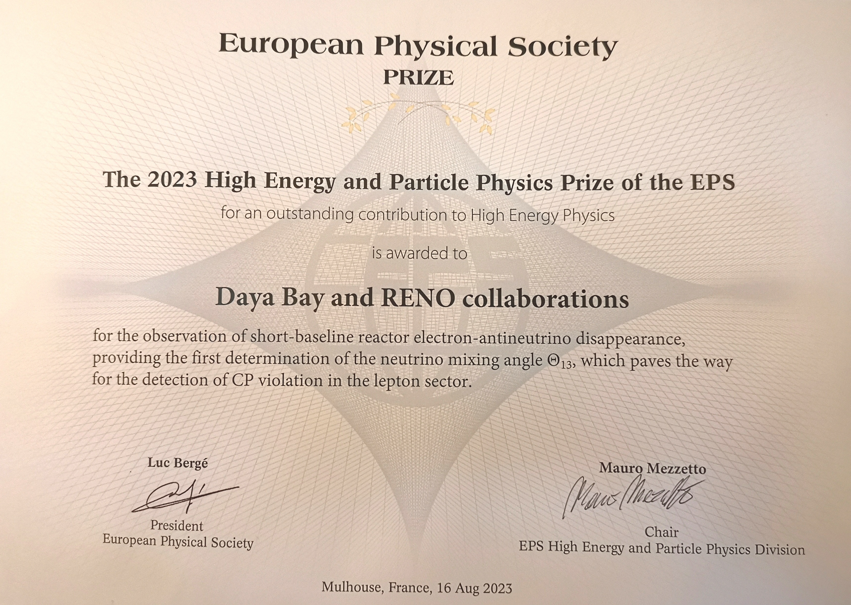 2023年4月24日,欧洲物理学会高能与粒子物理分会宣布,因“发现短基线反应堆电子反中微子消失,首次测定中微子混合角θ13,为探测轻子的电荷-宇称破缺铺平了道路”,高能所主持的国际合作大亚湾实验和韩国RENO实验荣获2023年度欧洲物理学会高能与粒子物理奖(High Energy and Particle Physics Prize of the European Physical Society)。分享同一奖项的还有瑞典科学家Cecilia Jarlskog,获奖理由为“发现描述夸克和轻子电荷-宇称对称性破坏的不变量”。颁奖仪式于2023年8月21日在2023年欧洲物理学会高能物理大会上举行。