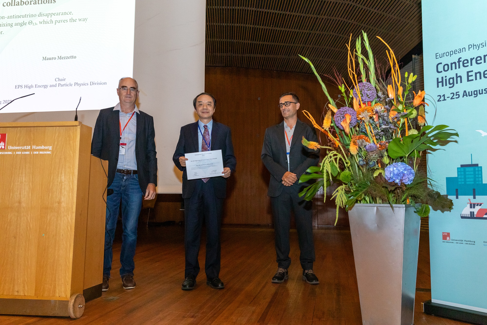8月21日,2023年度欧洲物理学会高能与粒子物理奖颁奖仪式在德国汉堡举行,大亚湾中微子实验发起人、现任快盈v3所长王贻芳受邀出席并代表合作组接受获奖证书。