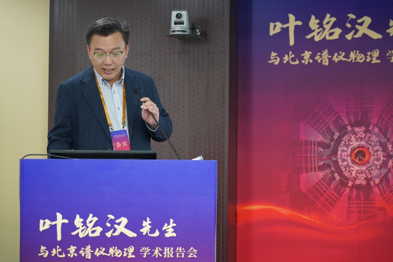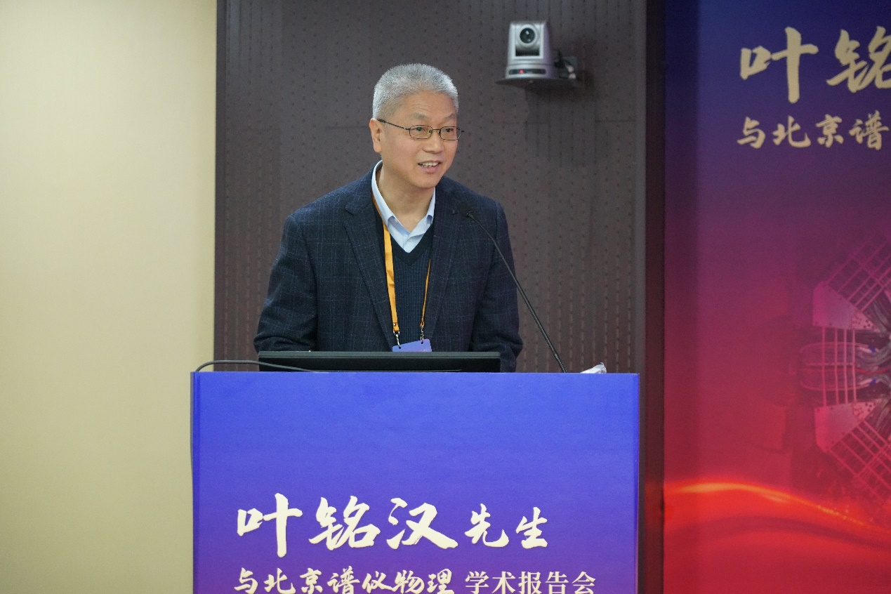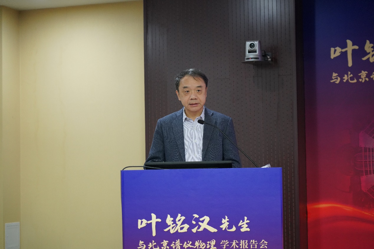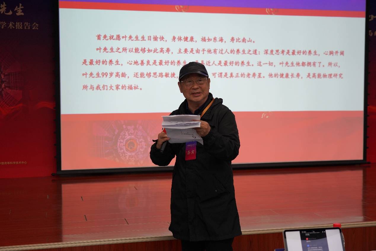 高能所所长王贻芳院士在开幕式中致辞。王贻芳向叶先生转达了中国科学院侯建国院长对叶先生的祝愿并宣读了诺贝尔奖获得者、叶先生的同窗挚友李政道先生的贺信。王贻芳在致辞中指出,我国的高能物理研究在世界高科技领域占有了一席之地,一大批重要科研成果不断涌现,这些成绩离不开叶先生的卓越贡献。他表示回顾叶先生的百年人生历程,“锲而不舍、做出成绩”的理想与信仰贯穿始终。叶先生是德高望重的长者、潜心研究的科学家,也是言传身教的教育家、掌控大局的管理者,他为了培养高能物理人才孜孜不倦,无私奉献,举办这次会议不仅为了表达对他的崇敬之情,更是为了弘扬叶先生崇高的思想品德和科学精神,推动高能所加快抢占科技制高点,为我国高能物理事业创新发展、实现高水平科技自立自强再立新功。