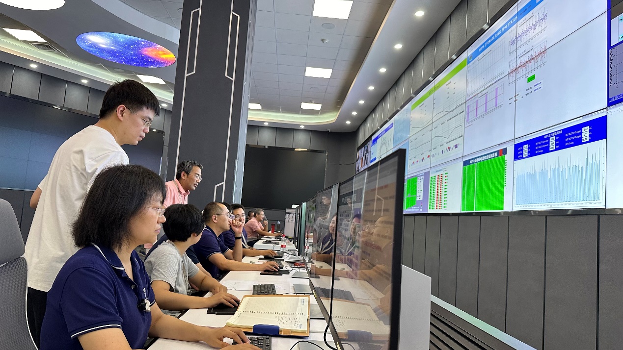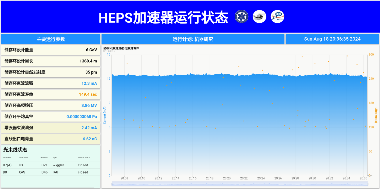 8月6日凌晨,HEPS储存环首次成功实现单束团束流存储。随后启动多束团注入调试,并通过斜四极铁强度调节、全局及局部闭轨测量与校正、注入束电荷量及稳定性优化等手段,持续提升存储流强和束流寿命。