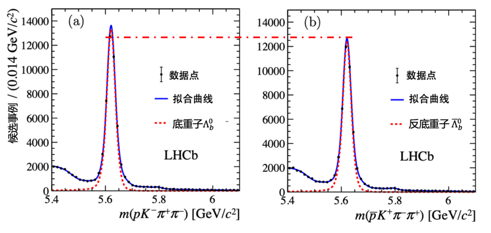 LHCb实验观测到(左)底重子和(右)反底重子衰变的产额显著不同,从而首次在重子衰变中发现CP破坏。