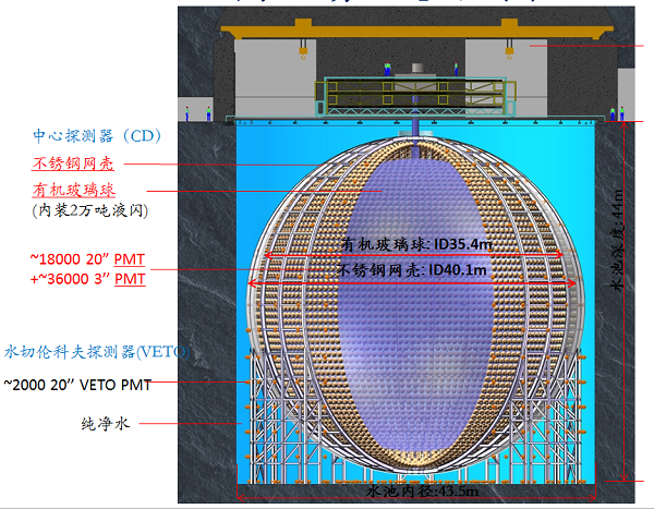 中心探测器结构示意图如图1所示,其整体形状为球形,置于直径约为43.5m,深44m的水池中。中心探测器主体结构分内层结构和外层结构,其中内层结构为直径(内径)35.4m的有机玻璃球壳,该球壳通过一定数量的支撑杆连接在外层不锈钢球面网壳上,钢网壳内径为40.1米,外直径为41.1米。有机玻璃球内装有2万吨液体闪烁体(后面简称为液闪),液闪密度为860kg/m^3,其主要成分为烷基苯。不锈钢网壳的内表面安装有约18000只20英寸的朝内的光电倍增管(后面简称PMT),探测中微子;在每三个20英寸PMT中间,安装一个3吋小PMT,用来刻度20吋PMT,总共约有25000只3吋PMT;在中心探测器不锈钢网壳的外围还安装有约2400只20英寸的朝外的PMT,这些PMT用以探测宇宙线产生的切伦科夫光满足反符合探测器(简称VETO)的探测需求。在不锈钢网壳的外侧需要安装26圈水平线圈和30圈竖直线圈,用来屏蔽地磁场,避免地磁场对PMT性能产生影响。为了让水契仑科夫探测器尽可能多的收集到光信号,在水池侧壁、水池底面和顶部、不锈钢网壳表面上,都将铺设Tyvek反射纸。在有机玻璃球和不锈钢网壳之间以及不锈钢网壳和水池池壁之间,均有超纯水,它既作为屏蔽液体,也是反符合探测器的介质。中心探测器整体结构通过一定数量的立柱固定于水池底部。