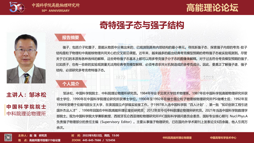 【09.22】建所50周年系列活动之高能理论论坛--奇特强子态与强子结构