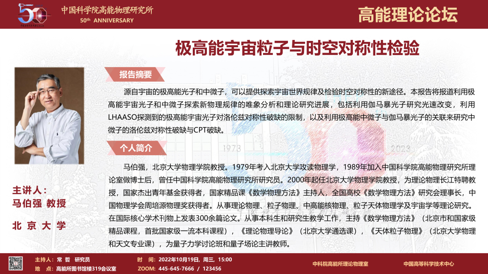 【10.19】建所50周年系列活动之高能理论论坛--极高能宇宙粒子与时空对称性检验