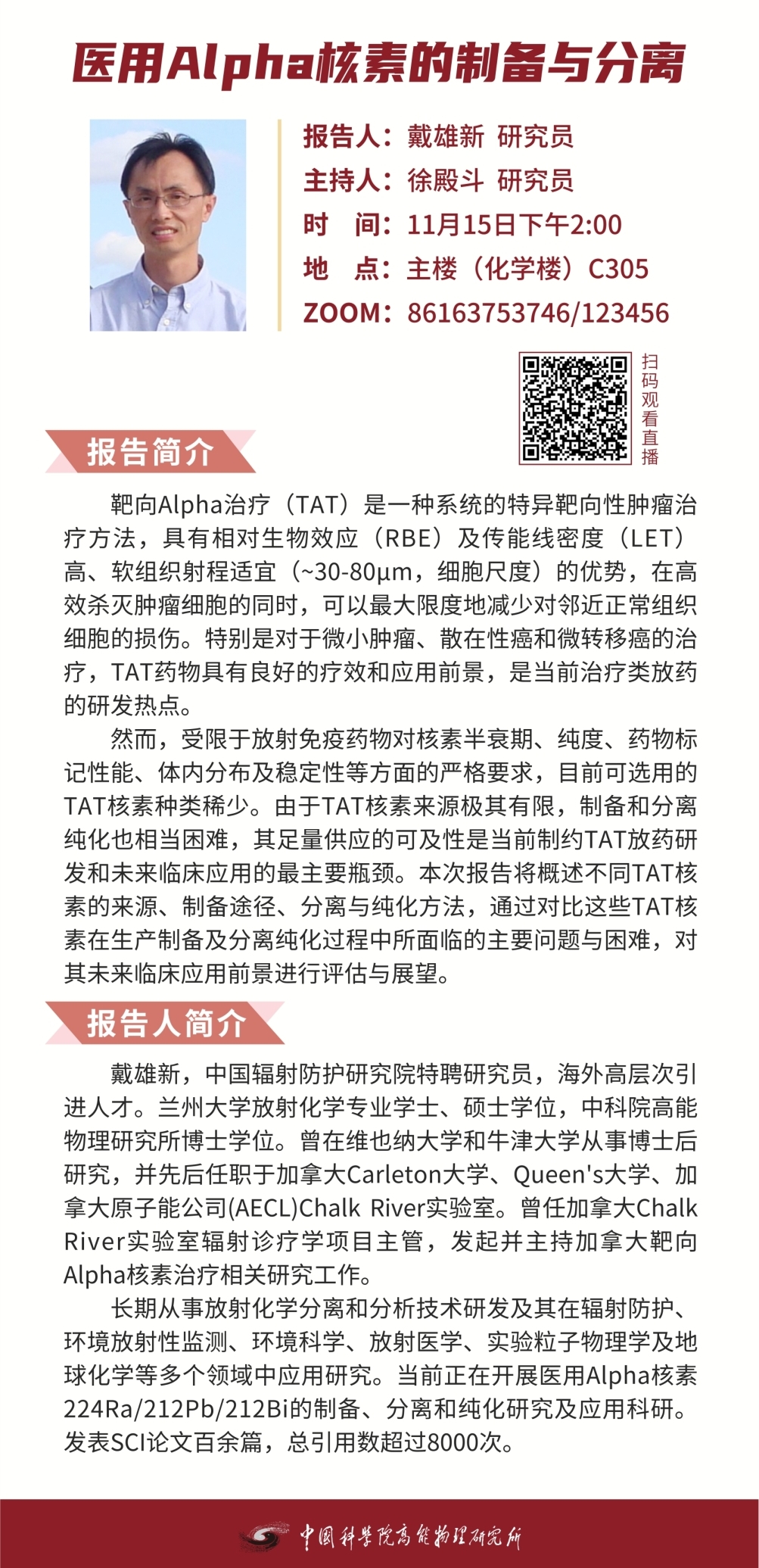 【11.15】建所50周年系列活动之高能所科技创新论坛(363)医用Alpha核素的制备与分离
