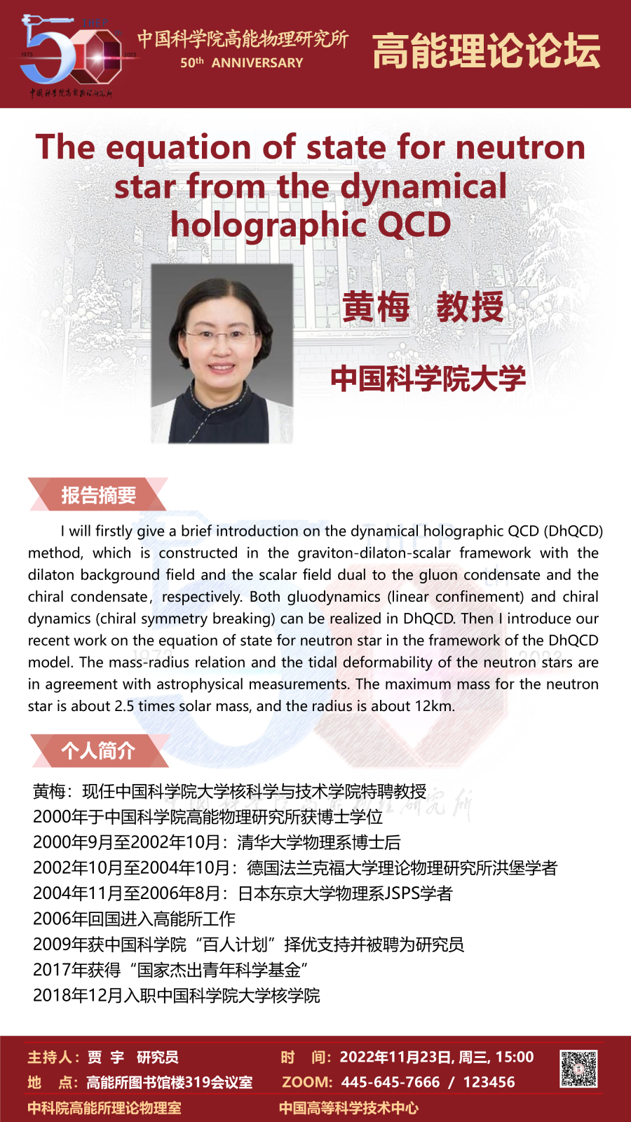 【11.23】建所50周年系列活动之高能理论论坛--The equation of state for neutron star from the dynamical holographic QCD