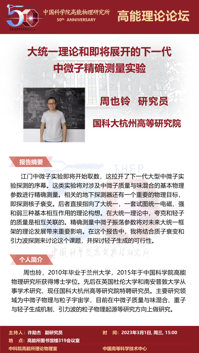 【03.01】建所50周年系列活动之高能理论论坛--大统一理论和即将展开的下一代中微子精确测量实验