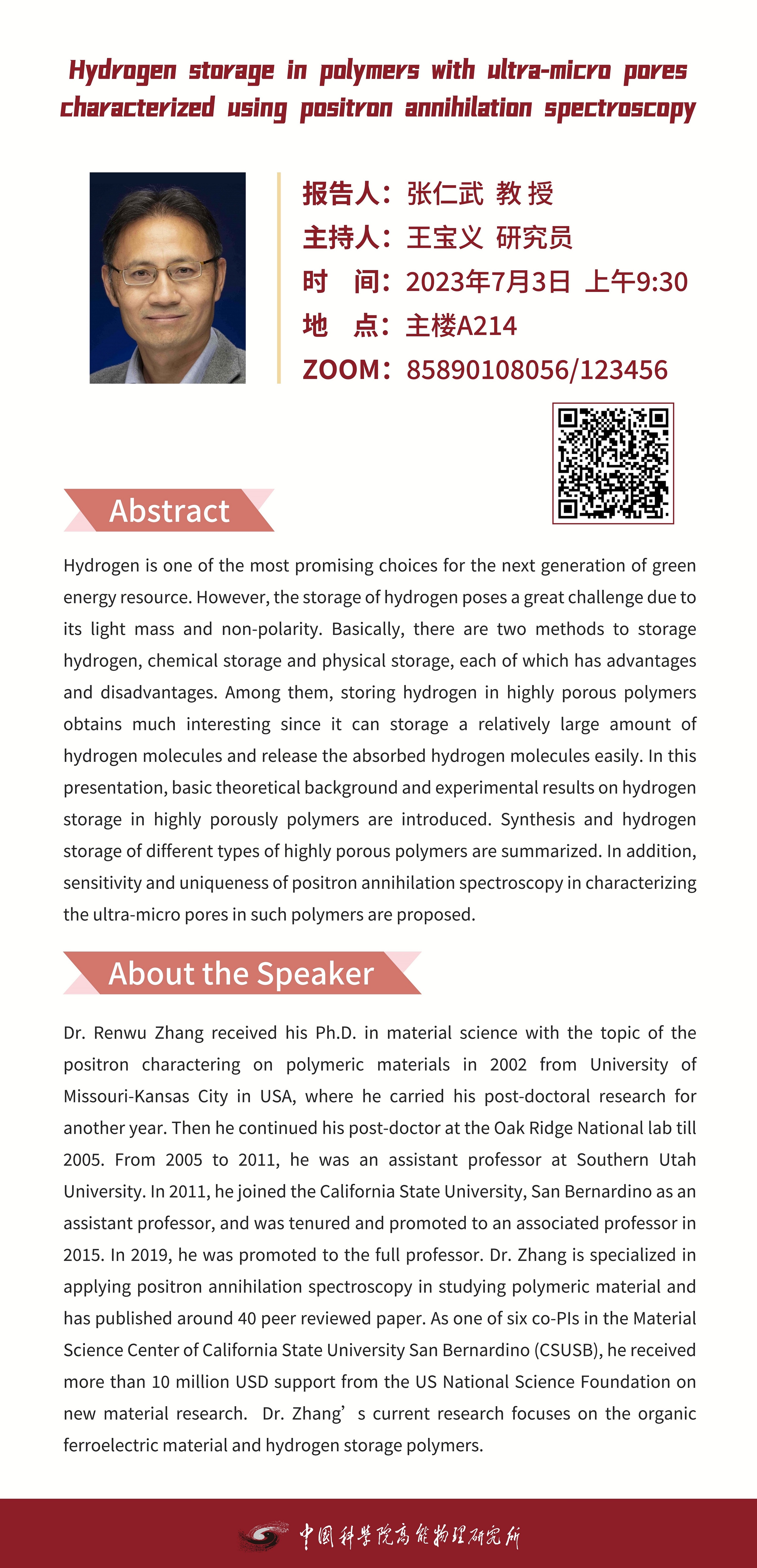 【07.03】建所50周年系列活动之高能所科技创新论坛(372)Hydrogen storage in polymers with ultra-micro pores characterized using positron annihilation spectroscopy