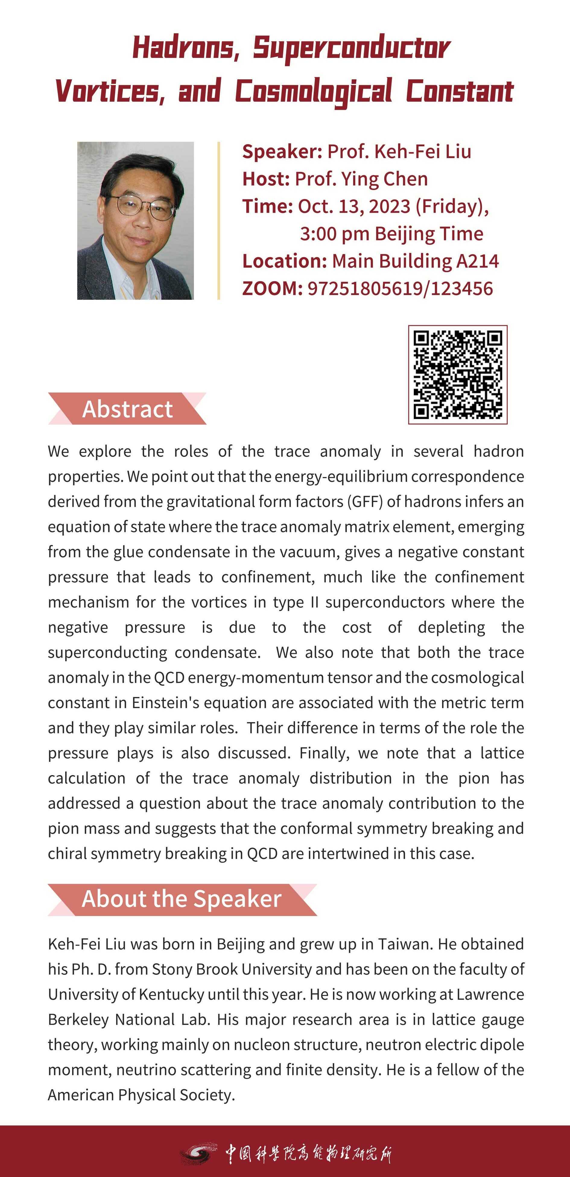 【10.13】建所50周年系列活动之高能所科技创新论坛(380)Hadrons, Superconductor Vortices, and Cosmological Constant