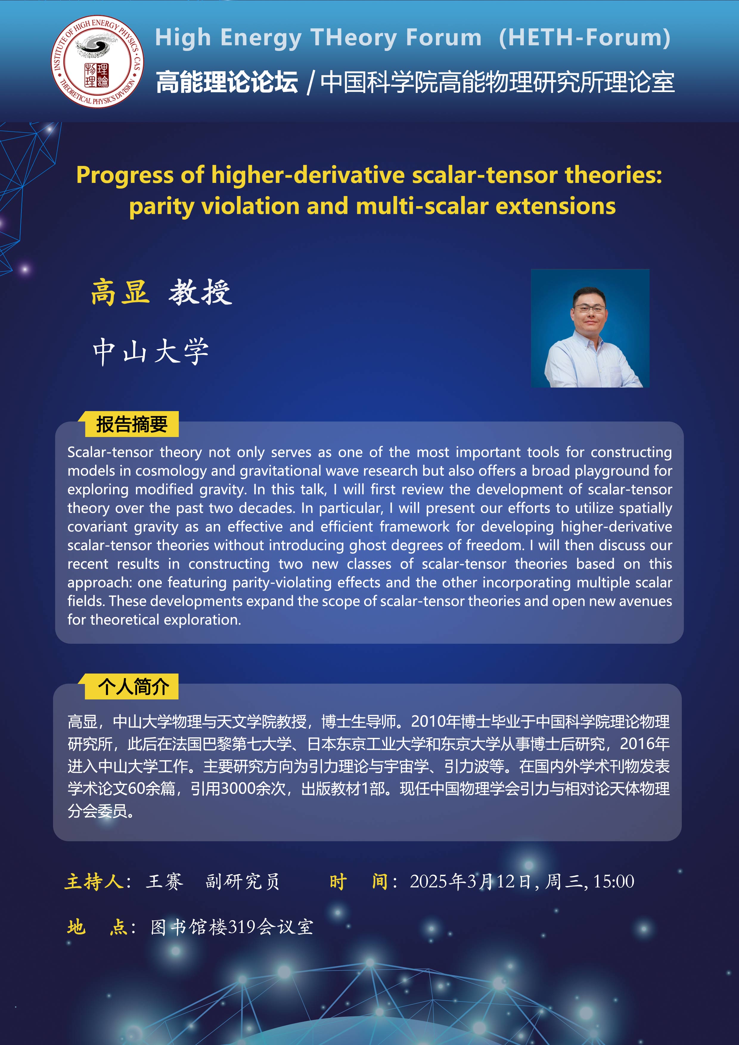 【03.12】高能理论论坛第91期--Progress of higher-derivative scalar-tensor theories: parity violation and multi-scalar extensions