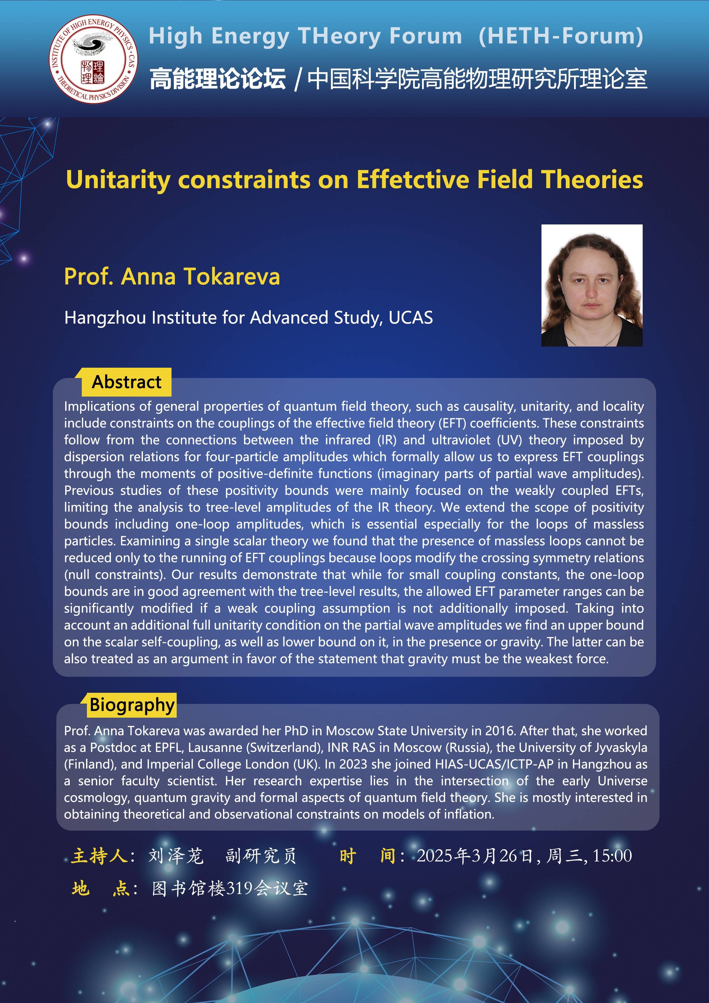 【03.26】高能理论论坛第92期--Unitarity constraints on Effetctive Field Theories