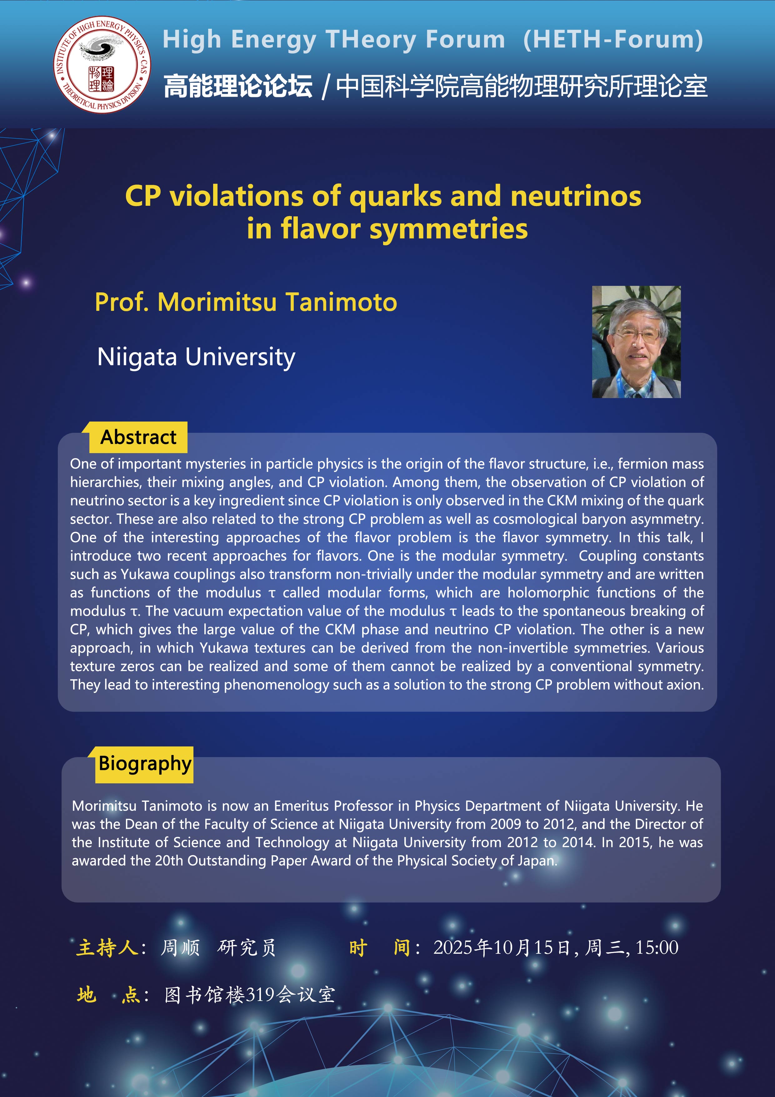 【10.15】高能理论论坛第107期--CP violations of quarks and neutrinos in flavor symmetries