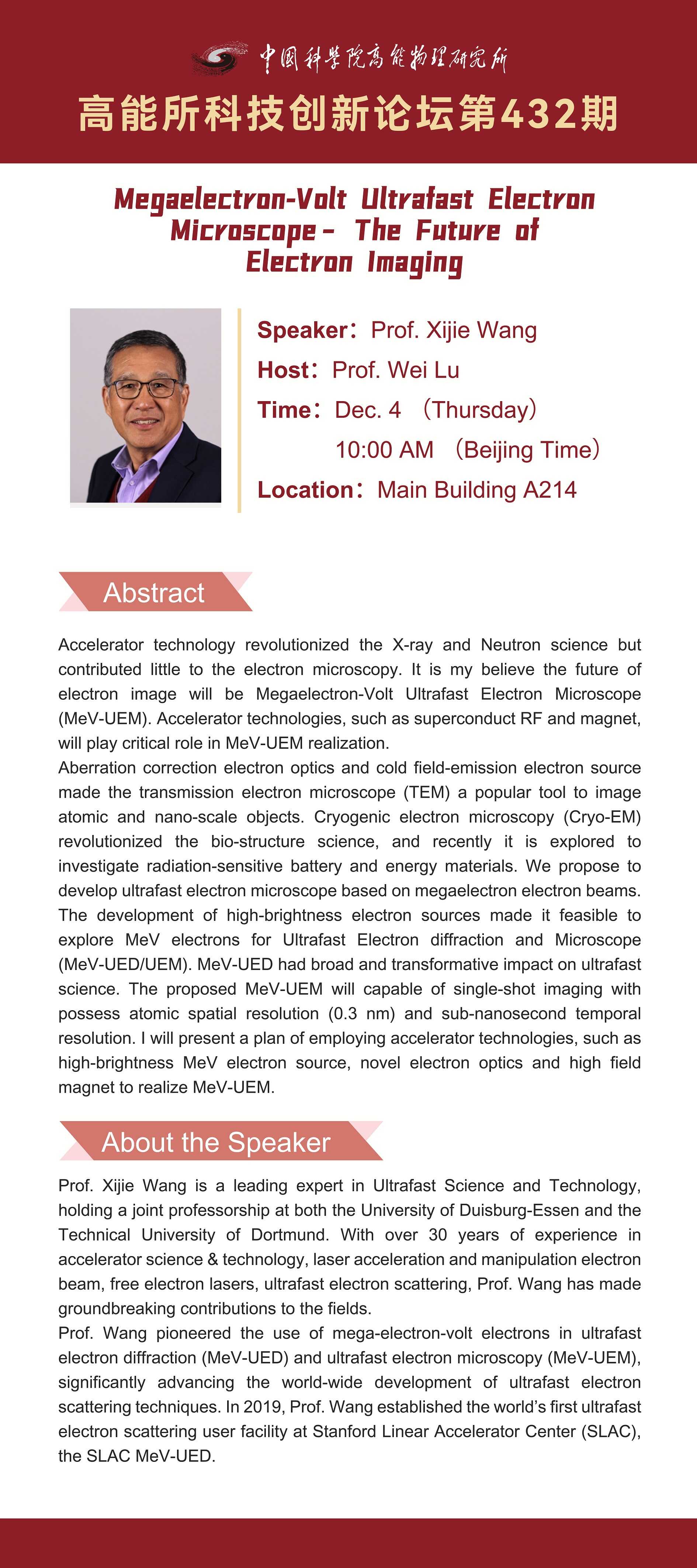 【12.04】高能所科技创新论坛(432)Megaelectron-Volt Ultrafast Electron Microscope – The Future of Electron Imaging