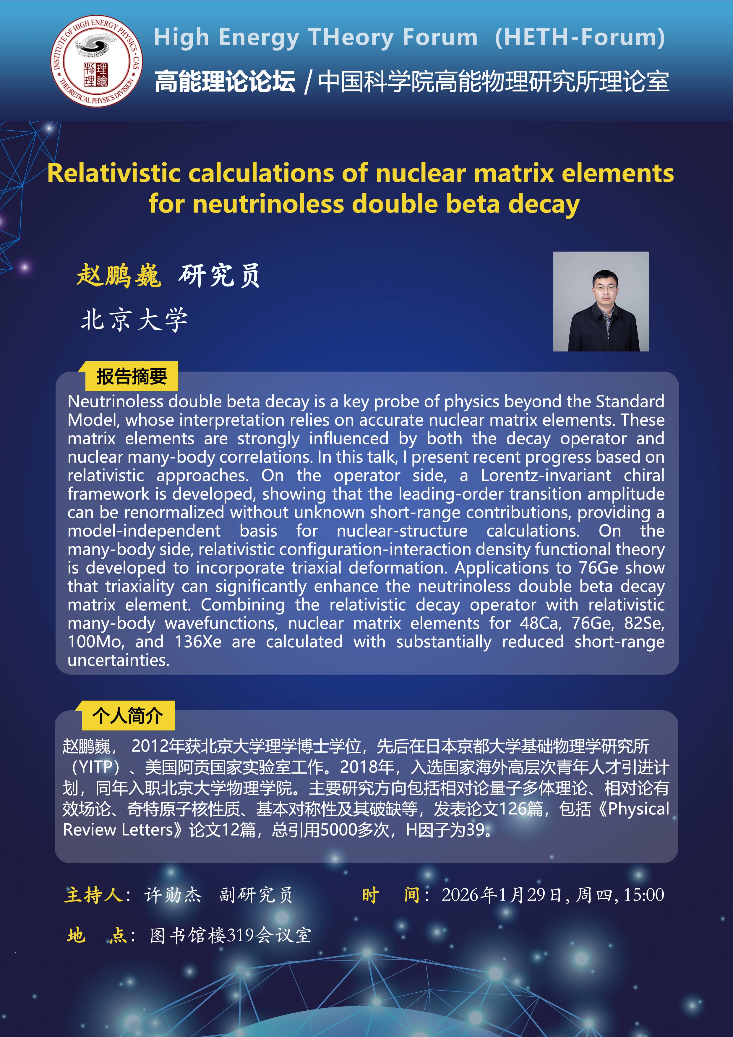 【01.29】高能理论论坛第122期--Relativistic calculations of nuclear matrix elements for neutrinoless double beta decay
