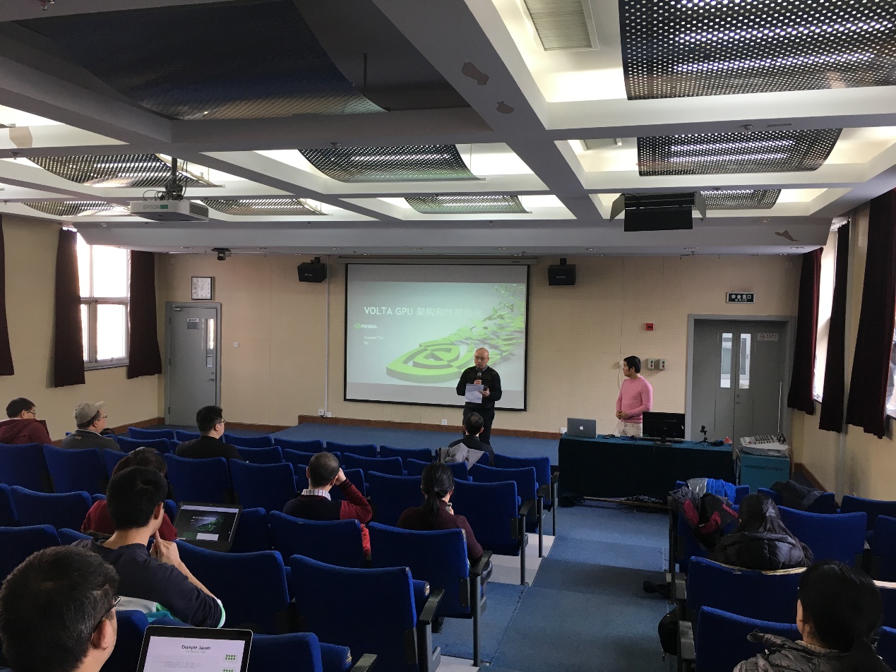 Daniel Tian博士介绍了CUDA编程的基础知识以及最新的Volta GPU架构和CUDA优化方法,特别针对控制流的并行和数据访问的并行方面,给出了多点建议。他还讲授了多GPU的并行技术,分别针对单线程、多线程、MPI进行编程。他在展望中指出,明年NVIDIA将提供PSTL (并行化C++标准模板库),将大大简化编程的复杂度,提高编程的效率。最后,参加培训的同学与专家进行了交流与讨论,来自NVIDIA公司的讲师们耐心解答了大家现场提出的问题。