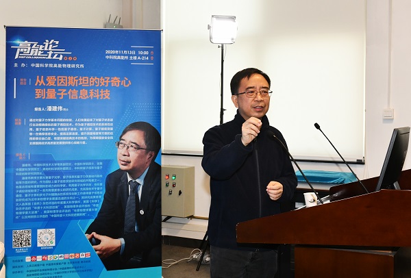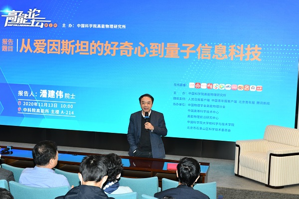 11月13日,由中科院高能所举办的“高能论坛”迎来了量子物理学家、中国科学院院士潘建伟。论坛上,潘建伟作了题为《从爱因斯坦的好奇心到量子信息科技》的报告,报告由高能所所长王贻芳主持。