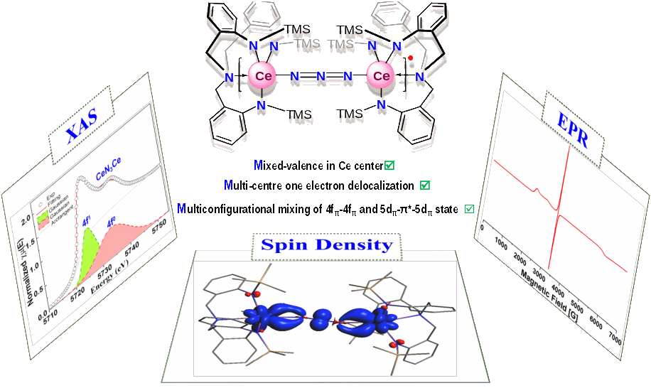 在本工作中,研究人员利用课题组开发的三脚架Trapen配体制备了(TrapenTMS)CeIVCl配合物,并与NaN3反应成功合成了首例多中心单电子离域效应的Ce-N3-Ce配合物[{(TrapenTMS)Ce}2(μ-N3)]。通过X-射线单晶衍射、核磁共振波谱、紫外-可见-近红外吸收光谱、超导量子干涉仪磁学(SQUID)和电子顺磁共振(EPR)X-射线吸收谱(XAS)等实验表征手段并结合量子计算化学研究了该配合物的精细结构、电子特征及成键性质。研究表明,该配合物中两个混价的Ce原子被N3-离子桥连,形成反式弯折扭转构型的Ce-N3-Ce单元。低温(2 K) EPR测试显示其具有明显的电子离域特性(g = 2.003)。量子化学计算发现电子自旋密度分布在骨架Ce-N3-Ce上,揭示了由于Ce(5dπ)-N3(π*)-Ce(5dπ)的参与,单占据分子轨道(SOMO)中存在强烈的4f/5d轨道混合,使得体系中的单电子延伸到Ce-N3-Ce区域,形成了多中心单电子(Ce-N3-Ce)的相互作用。