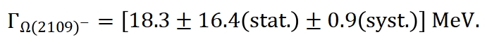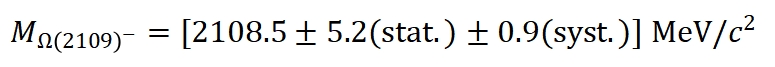 BESIII实验在高能量区域采集的大量数据样本,通过开发出的新的研究方法,在实验上证实了Ω(2012)-存在的证据(信号显著性为3.5标准偏差),同时,BESIII合作组首次发现了一个新的超子激发态的实验证据,信号显著性达到了4.1 标准偏差,如图1所示,研究团队将其命名为Ω(2109)-。测量到的质量和宽度分别为: