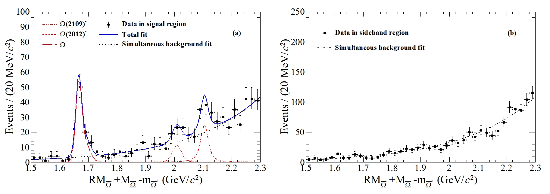 图1:数据中信号区域(a)和边带区域(b)对应的反冲质量谱的联合拟合。