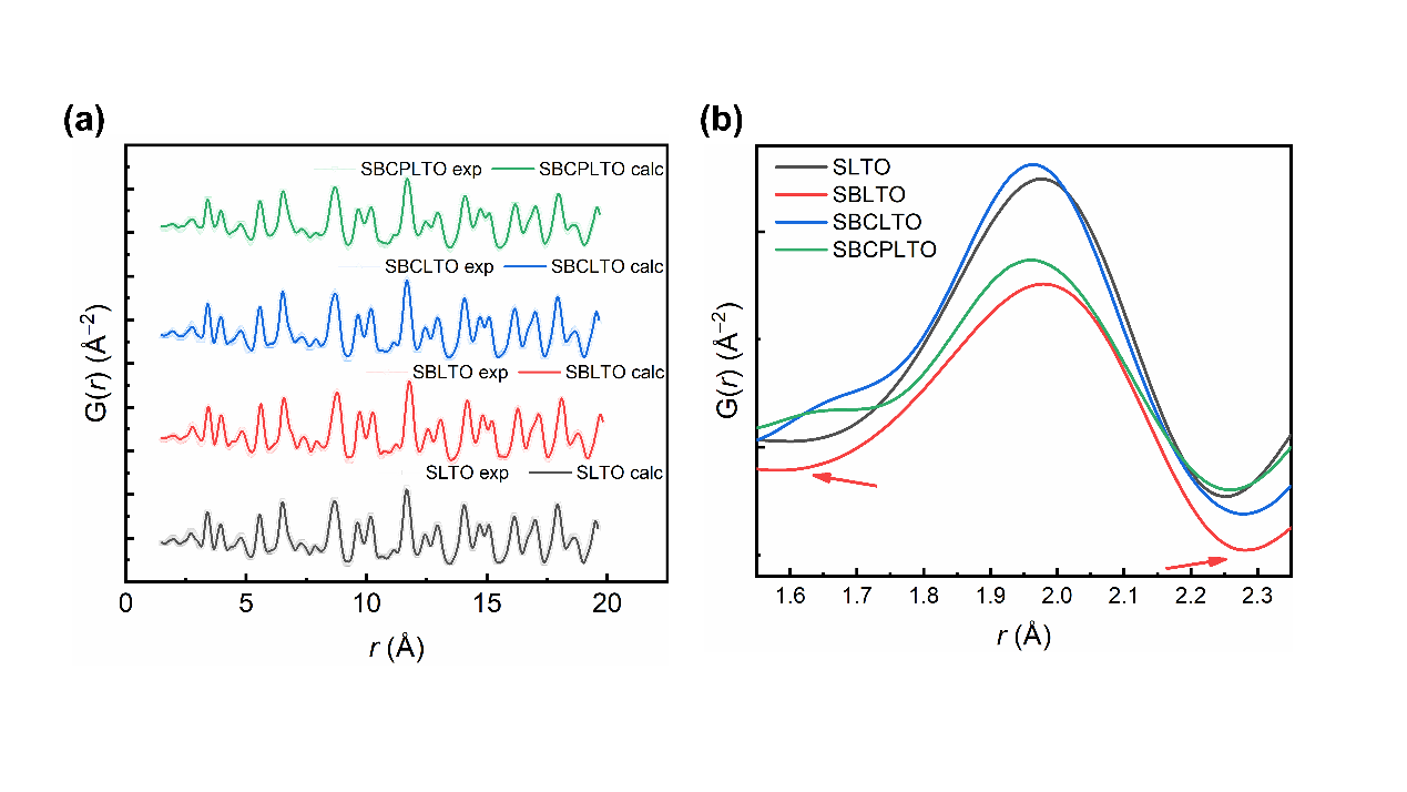 图1. 变熵酸锶基热电材料的全散射实验数据及逆蒙特卡洛拟合结果,(a)总对分布函数; (b) Ti-O 部分对分布函数