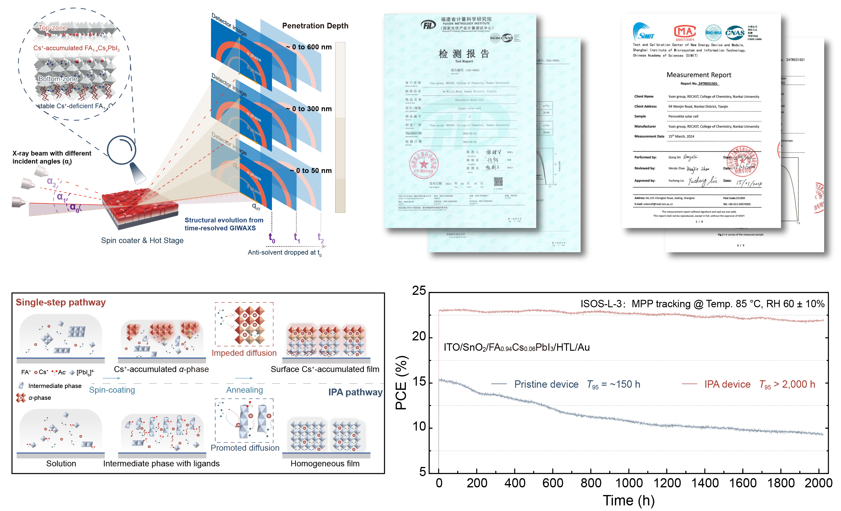 结晶路径转变策略实现高效率高温工况稳定FACsPbI3钙钛矿太阳能电池 近日,南开大学袁明鉴课题组联合中外课题组开展了高水平合作研究,借助北京、上海同步辐射装置揭示了无甲胺辅助的FACsPbI3合金钙钛矿显著的结晶与物相时空差异性是导致薄膜内部存在化学组分异质性的关键原因。这一组分不均一性直接导致了器件在高温工况条件下的性能衰减。基于上述发现,研究团队与合作单位进行了深入的理论模拟分析。为了探明薄膜结晶行为和薄膜组分分布规律,快盈v3陈雨高级工程师研发了紧凑型的便携式原位溶液旋涂成膜装置,在北京同步辐射1W1A漫散射实验站对钙钛矿薄膜的结晶过程进行了原位(旋涂及退火)监测,并结合多种表征方法,探测薄膜结晶过程中不同深度的结晶过程结构演变,发现了薄膜不同深度结晶行为差异性。基于此,研究人员首次提出了具有普适性的配体辅助结晶路径转变策略,并通过线站原位装置证实了结晶调控策略的可靠性——薄膜具有均匀的结晶过程,最终实现了高质量均一组分FACsPbI3合金钙钛矿薄膜的可控制备,彻底解决了FACsPbI3钙钛矿薄膜的空间组分异质性问题,成功制备了兼具世界一流的能量转换效率与高温工况稳定性的钙钛矿太阳能电池器件。上述成果还取得福建国家光伏产业计量中心和中国科学院上海微系统与信息技术研究所的权威效率认证。 有机-无机杂化钙钛矿太阳能电池因其高效低成本,已成为新一代光伏技术的研究焦点。随着其从实验室小规模制备向大规模商业化应用的推进,钙钛矿电池在高温条件下的稳定性成为其进一步发展的主要瓶颈。当前,钙钛矿电池的高效性依赖于氯化甲铵添加剂,以稳定其物相并调控结晶。然而,该添加剂在高温下易分解,显著削弱了钙钛矿电池的高温运行稳定性。因此,开发无甲铵添加的FACsPbI3合金钙钛矿太阳能电池,成为实现高效与高稳定性钙钛矿光伏器件的关键路径,也是钙钛矿光伏技术产业化落地的核心需求。