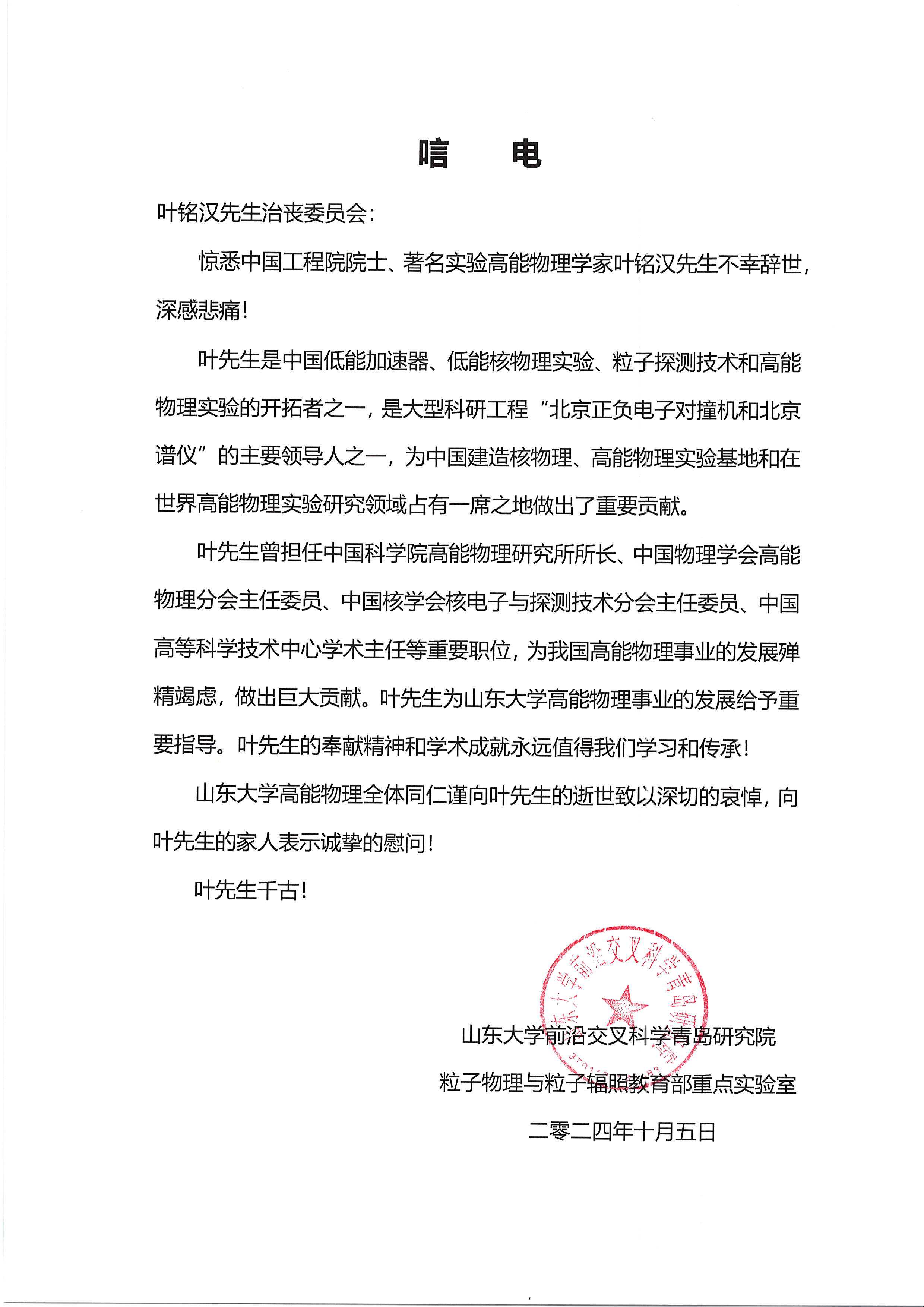 山东大学前沿交叉科学青岛研究院唁电