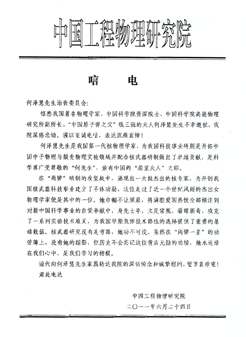 中国工程物理研究院唁电