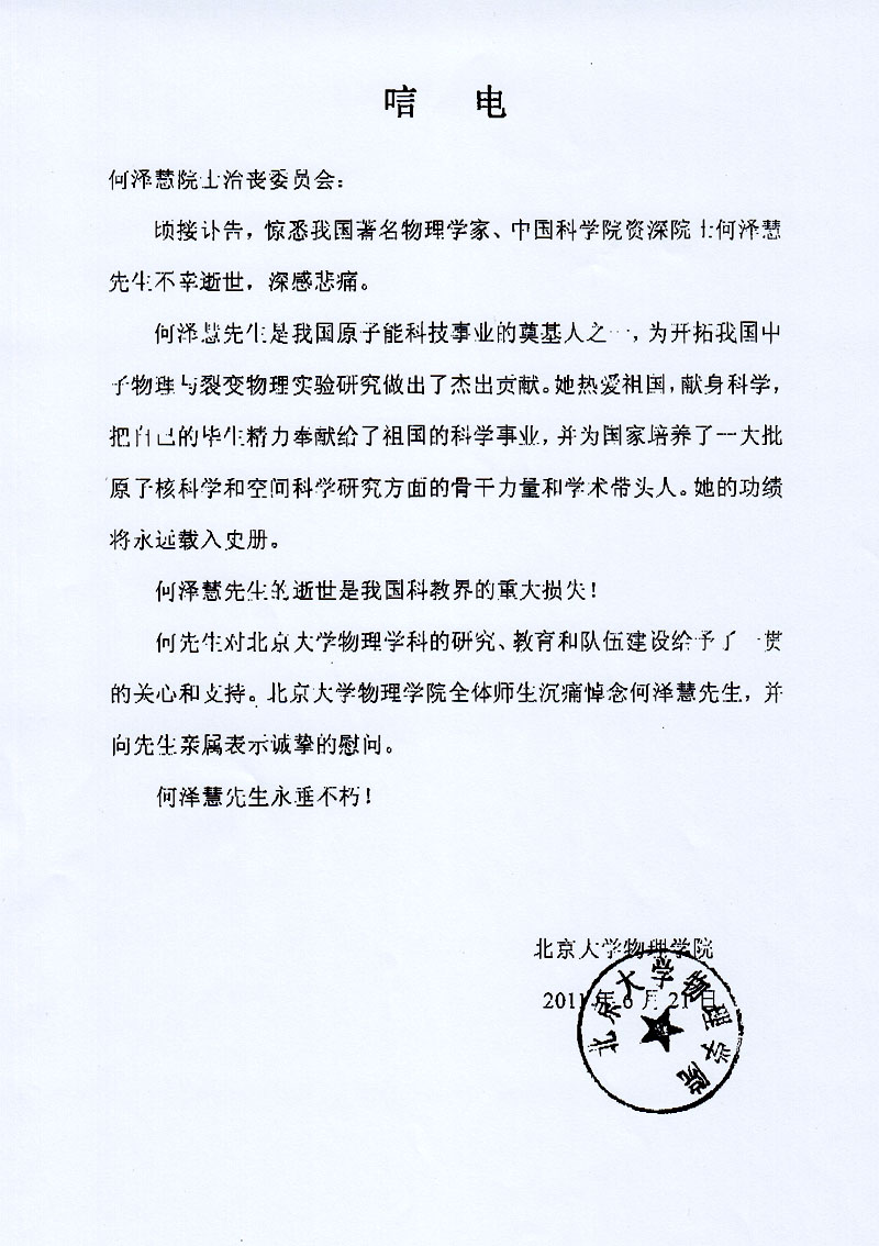 北京大学物理学院唁电
