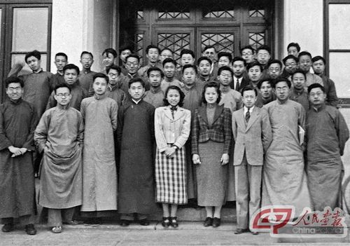 1940年,物理系师生在燕京大学物理楼前合影。(前起二排右三为谢家麟,前排右四为范绪篯)