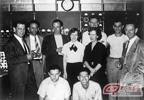 1950年,谢家麟(前排右)与美国斯坦福大学同事在1GeV电子直线加速器控制台前。