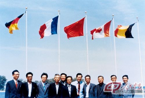 1978年,谢家麟(右四)率高能加速器设计考察组访问美国费米国家实验室,升起中国国旗后合影留念。