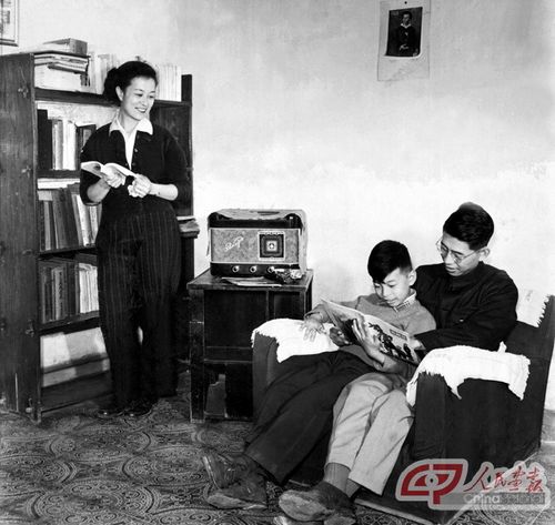 1955年,归国留学生谢家麟与妻子范绪篯、大儿子谢亚宁在家中。摄影?谢泗春/人民画报